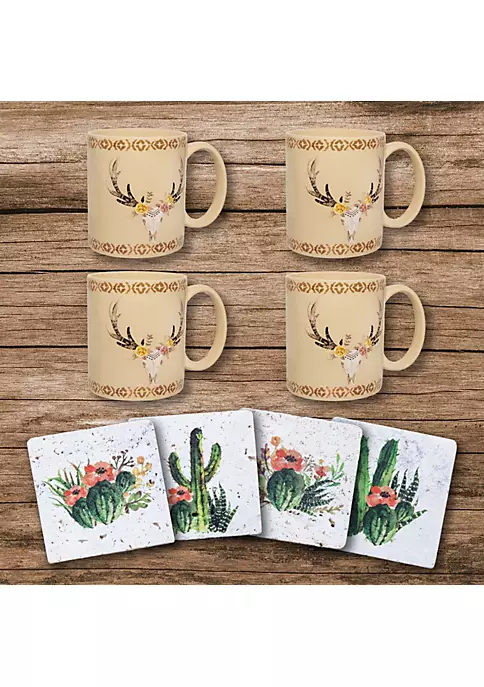 Looking for a set of coffee mugs and coasters to fit your style and personality? These desert skull mugs and coasters work beautifully for any southwestern home, capturing a delicate tone and bohemian lifestyle. Accessories your breakfast nook with rustic flair. Whether you are looking for something practical or something fun, you can find it here with these perfect combination of charming look and durable design. This set combines our Desert Skull Coasters and Floral Skull Mugs.